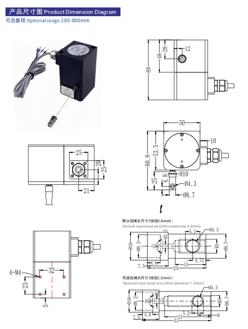 WS-S拉繩拉線式位移傳感器及其特點(diǎn):全防護(hù)外殼為鋁合金材質(zhì),更加美觀大方,拉繩可傾斜45°往外拉出,且不影響線性精度及其重復(fù)性。WS-S拉繩式位移傳感器,又稱拉繩尺,拉線尺,拉線式位移傳感器,拉繩位移傳感器,是直線位移傳感器在結(jié)構(gòu)上的精巧集成,充分結(jié)合了角度傳感器和直線位移傳感器的優(yōu)點(diǎn),成為一款結(jié)構(gòu)緊湊、測量行程長、安裝空間尺寸小、具有高精度測量的優(yōu)良傳感器。WS-S拉繩式位移傳感器系列產(chǎn)品行程從100mm至600mm可以定制, 具有模擬電流信號mA:4-20mA,模擬電壓信號V1:0-5V,V2:0-10V和RS485數(shù)字信號輸出。滿足大行程、高精度各種信號需求。
