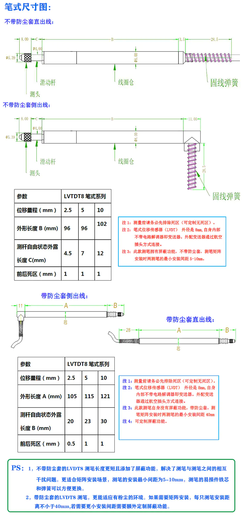 1.外徑Φ8mm筆形回彈式位移傳感器,