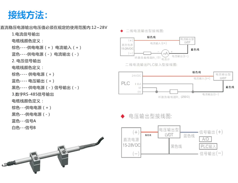 LVDT位移傳感器接線方式:直流穩(wěn)壓電源輸出電壓值必須在規(guī)定的使用范圍內(nèi)