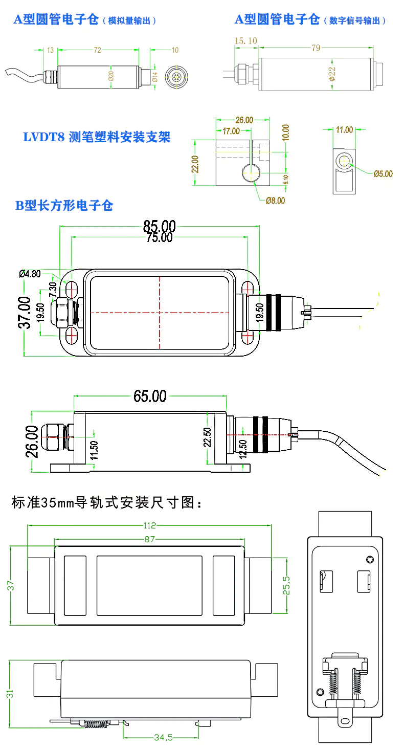 LVDT8筆式位移傳感器具有優(yōu)良的性能,適用于質(zhì)量控制和計(jì)量應(yīng)用中的高精度,高重復(fù)性的測(cè)量。測(cè)頭采用高硬度的耐磨材料氮化硅陶瓷,測(cè)軸移動(dòng)部分采用精密導(dǎo)軌。筆形位移傳感器外配變送器可輸出標(biāo)準(zhǔn)的直流信號(hào),采用方便的單電源+12~30V DC供電,電子電路密封在304不銹鋼金屬管內(nèi),可以在潮濕和灰塵等惡劣環(huán)境中工作。輸出信號(hào)為標(biāo)準(zhǔn)的可被計(jì)算機(jī)或PLC使用的0-5V,0-10V,4-20mA或RS485輸出。