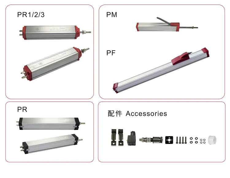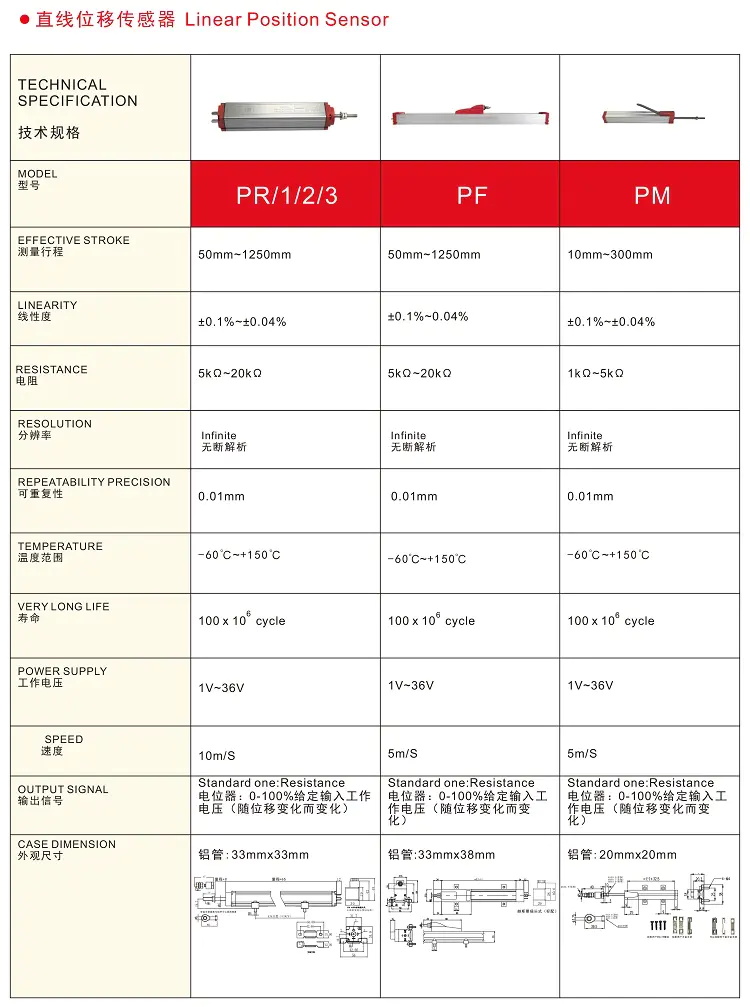 PR系列為拉桿式位移傳感器,PM系列為微型拉桿式位移傳感器,PF系列為滑塊式位移傳感器。